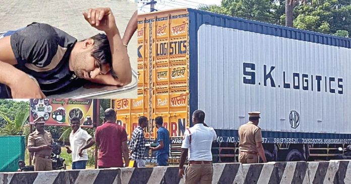 தகவலறிந்த கேரள போலீஸார் லாரியை பிடிக்க முயன்றுள்ளனர். எனினும், அவர்களிடம் சிக்காமல் தப்பிய லாரி, தமிழக எல்லைக்குள் நுழைந்தது. இந்த கன்டெய்னர் லாரி நாமக்கல் மாவட்டம் குமாரபாளையம் வழியாகச் செல்வதாக நேற்று காலை நாமக்கல் போலீஸுக்குத் தகவல் கிடைத்தது. இதையடுத்து, காவல் கண்காணிப்பாளர் எஸ்.ராஜேஸ்கண்ணன் தலைமையிலான போலீஸார் குமாரபாளையம்-வெப்படை சாலையில் வாகன சோதனையில் ஈடுபட்டனர். அப்போது, அவ்வழியாக வந்த கன்டெய்னர் லாரி, வாகனங்கள் மீது மோதி விட்டு, நிற்காமல் சென்றது.