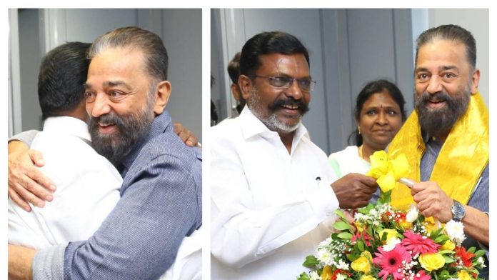 2026 தமிழ்நாடு சட்டப்பேரவைத் தேர்தலில் மக்கள் நீதி மய்யம் நேரடியாகப் போட்டியிடப் போவதில்லை என அக்கட்சியின் தலைவர் கமல்ஹாசன் அறிவித்துள்ளார். இதற்கு திருமாவளவன் பாராட்டு தெரிவித்துள்ளார். சட்டப்பேரவைத் தேர்தலில் மக்கள் நீதி மய்யம் நேரடியாகப் போட்டியிடப் போவதில்லை என அக்கட்சியின் தலைவர் கமல்ஹாசன் அறிவித்துள்ளார். சென்னை அண்ணா அறிவாலயத்தில் திமுக தலைவரும், முதலமைச்சருமான மு.க.ஸ்டாலினை நேரில் சந்தித்து பின், செய்தியாளர்களிடம் பேசிய அவர், திமுக ஆட்சி மீண்டும் மலர வேண்டும் என்பதே தான் எடுத்திருக்கும் முடிவு என்று கூறினார். வெளியில் இருந்து திமுகவிற்கு அழுத்தமாக ஆதரவு கொடுப்போம் என்றும் தெரிவித்தார்.