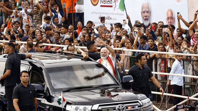 தமது காரின் முன்பக்க கதவைத் திறந்தபடி காரில் காலை ஊன்றி நின்றபடியே வெளியே திரண்டிருந்த மக்களை நோக்கி அவர் கையசைத்தபடி விழா மேடைக்குச் சென்றார். அதன்பின், ரூ. 5,400 கோடியிலான பல்துறை வளர்ச்சித் திட்டங்களை பிரதமர் மோடி குஜராத்தில் இன்று தொடக்கி வைத்தார்.