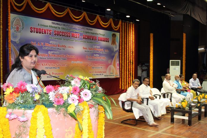 The motto of Students’ Success Meet-Achievers Award is to encourage the students to strive hard to achieve more success in their future endeavours, said TTD JEO for Health and Education Smt Sada Bhargavi. In her address during event at Mahati Auditorium in Tirupati on Monday evening, the JEO said, the pupils who are pursuing education in TTD educational institutions have the divine blessings of Sri Venkateswara Swamy.