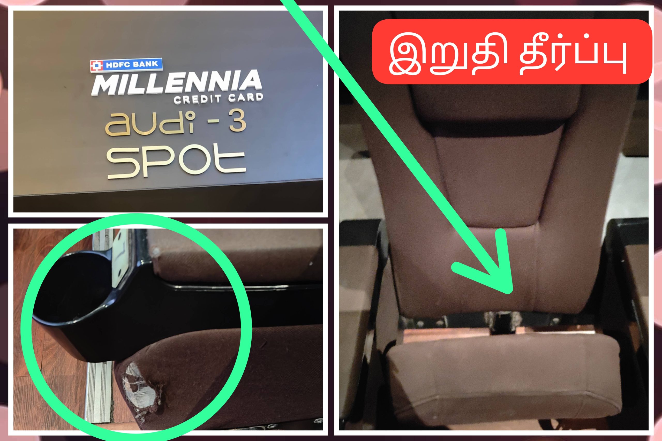 இதன் டிக்கெட் விலையாக ரூ54.35 மற்றும் ஆன்லைன் புக்கிங் கட்டணமாக ரூ16.52 ஆக மொத்தம் 70.87ரூ க்கு விற்பனை செய்து வரும் பி.வீ.ஆர் அமரும் இருக்கைகளை இப்படி வைத்திருப்பது சரியா? பி.வீ.ஆர் மேலாளர்கள் ஆய்வு செய்வதில்லையா? இதே நிலை தொடர்ந்தால் பி.வீ.ஆர் தியேட்டருக்கு நம்பி வரும் பார்வையாளர்களின் எண்ணிக்கை குறை அதிக வாய்ப்பு இருக்கிறது. PVR கிழிந்த இருக்கைகளை மாற்றி தனது பெயரை தக்க வைத்து கொள்ளுமா? அல்லது பட்ஜெட் டிக்கெட் தானே என்று கண்டு கொள்ளாமல் இருக்குமா? என்று பார்ப்போம்.